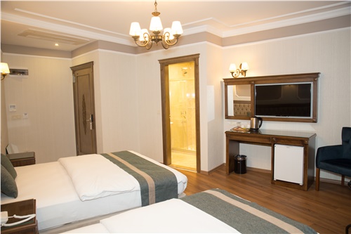 2+1 Kişilik Odalarımız özel yapım mobilya, aydınlatma, karartma perdesi ve benzersiz yatak başlarıyla özel olarak tasarlandı.